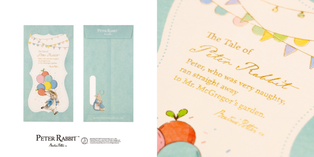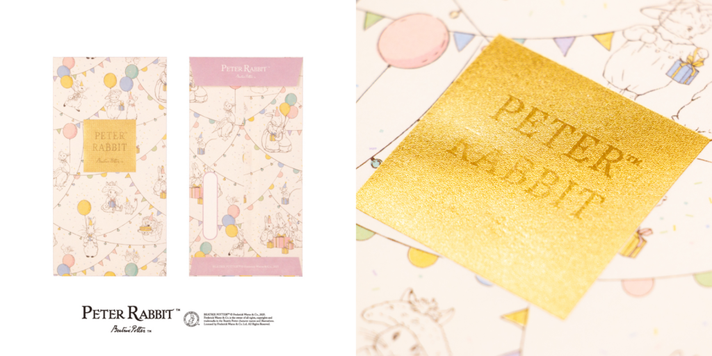 紙の産地愛媛県で抄紙された伊予和紙を使用しており、和紙の質感と箔押しの輝きがピーターラビット™の世界観を豪華に彩ります。