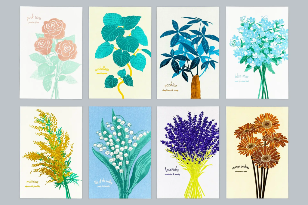 6色のクリームソーダを、さまざまな印刷技法を組み合わせた4種のデザインで味わう、手仕事のぬくもりと技法の個性が光るカードから、お気に入りの1枚をどうぞお手に取ってお楽しみください。