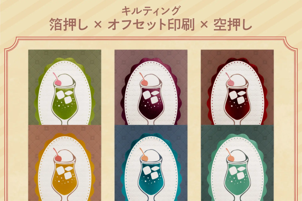 箔押しとは、金属の版を用い、熱と圧力で箔を紙などに転写する技法です。版に細かな模様を彫刻することで、額縁の柄やソーダの氷、さくらんぼなどのモチーフに、立体感を加え、色の違いを表現しています。
