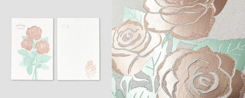 熱と圧力によって、紙に箔を圧着させる技法です。浮世絵の木版画を刷り上げていくように、1枚ずつ金属板をつくり、2度3度と箔を重ねて絵柄を完成させていきます。