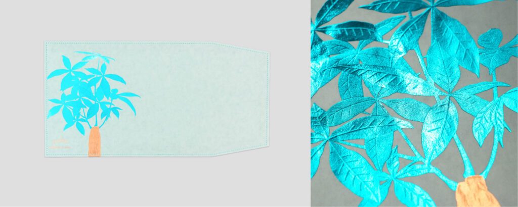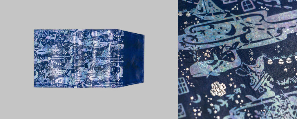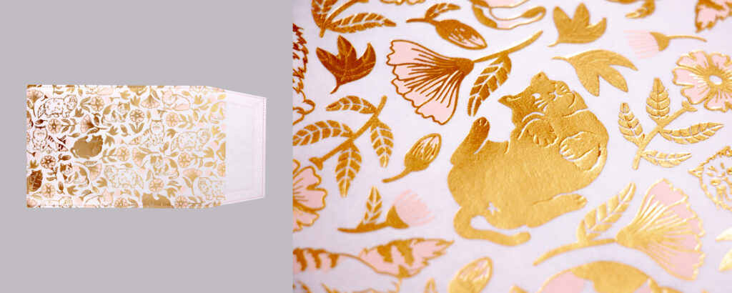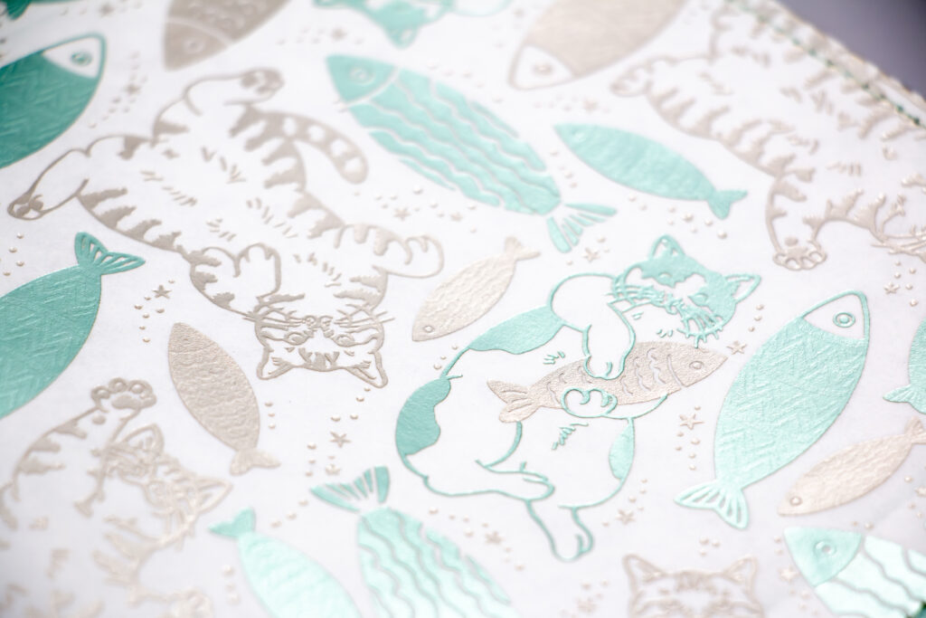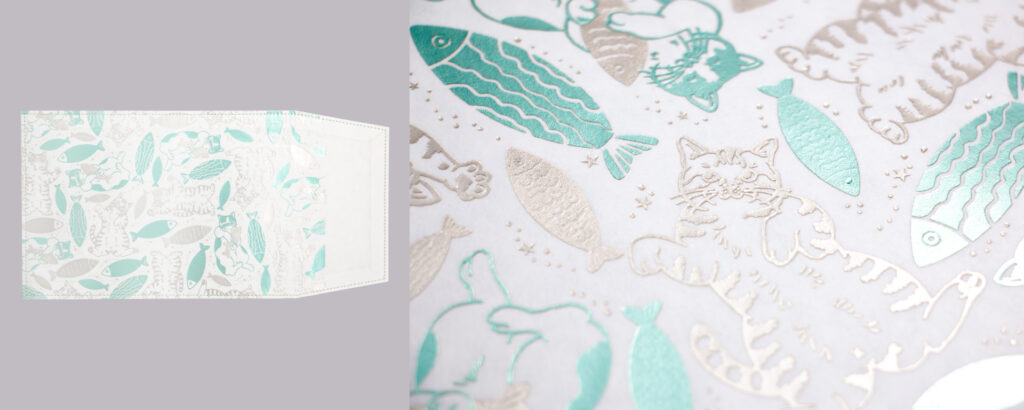 受賞された「fish」のデザインは全面が箔押しで表現されたかわいい猫のイラストが、他にはない魅力を引き出しています。フィンランドで開発された、布のような質感の紙「PAPTIC」を使用することで、箔押し加工と縫製を実現した新感覚のブックカバーです。