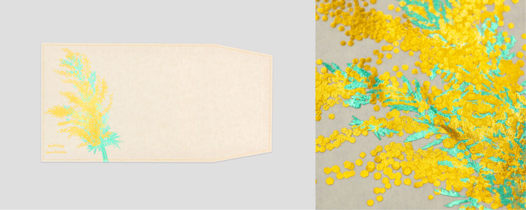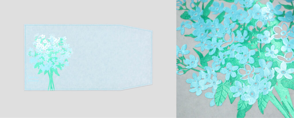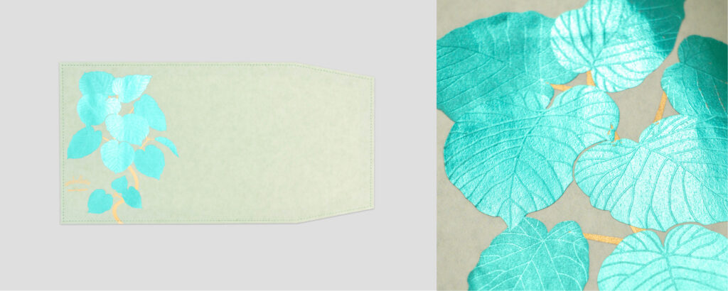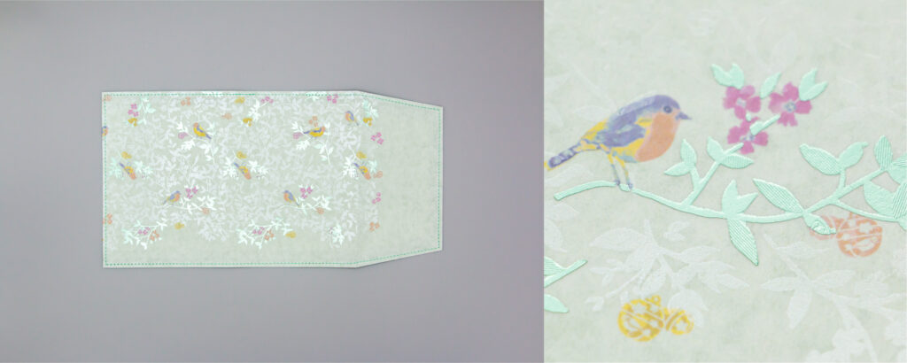 熱と圧力によって、紙に箔を圧着させる技法です。浮世絵の木版画を刷り上げていくように、1枚ずつ金属板をつくり、2度3度と箔を重ねて絵柄を完成させていきます。