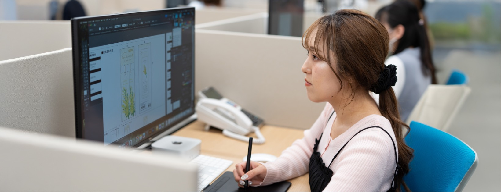前職は寝具・カバー類などを手掛ける、ホームファブリックメーカーのデザイナー。動物の図柄を活かしたデザインを得意としていたが、「もっと自分発信で提案できるデザインの仕事に就きたい」と考え、フタバ株式会社へ入社。現在は商品企画チームで、箔押しブランド『ROKKAKU』の企画や、グラフィックデザインを担う。