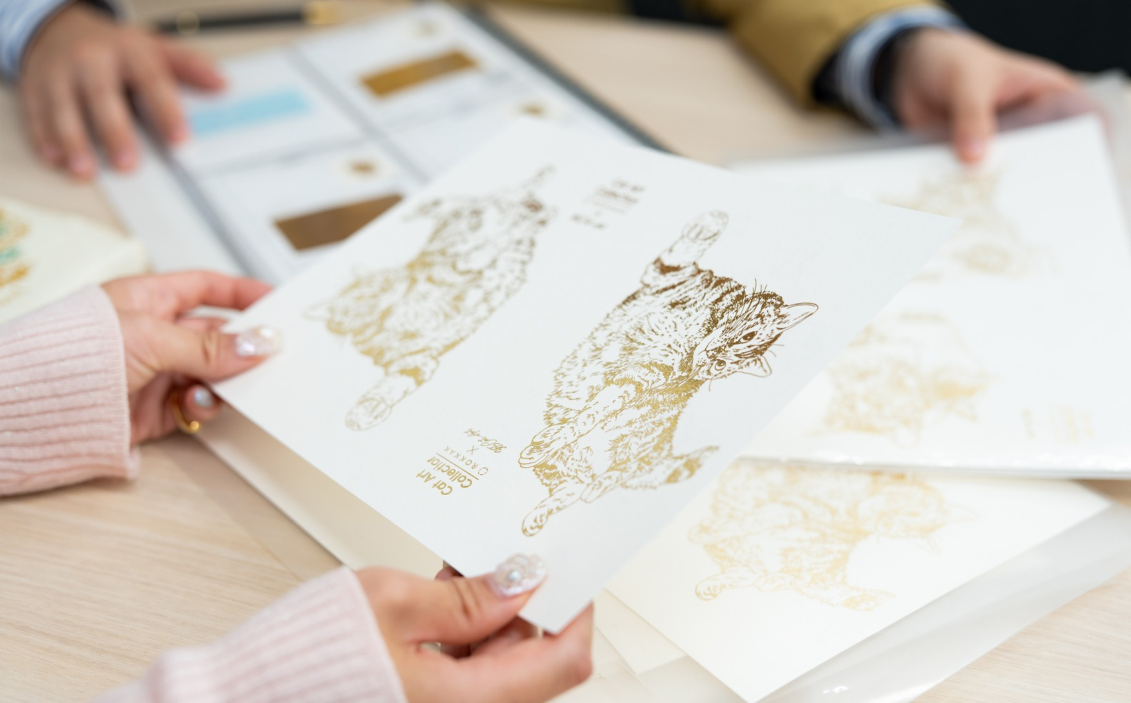 私が企画を担当した、猫ちゃんをモチーフとした箔押しステーショナリーシリーズ『Cat Art Collection (キャットアートコレクション)』も、まさにその一つ。展示会やSNSで作品をお見掛けして以来、ずっと気になっていた作家さんへ「弊社とコラボしていただけませんか?」とメッセージを送り、商品化に至っています。作家さんの作風や世界観と、猫という普遍的な魅力を持つアイコン、そして『ROKKAKU』の繊細な箔押し技術がぴったり合い、展示即売会では老若男女幅広いお客様にご購入いただけました。